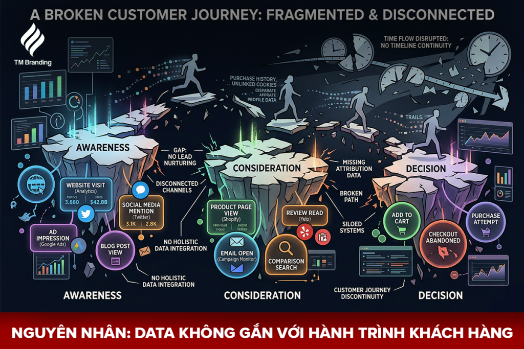 • Phân mảnh kênh thông tin: Dữ liệu từ website, mạng xã hội và quảng cáo không được đồng bộ, khiến doanh nghiệp khó xác định đúng nỗi đau (pain point) thực sự của người dùng ở từng giai đoạn.