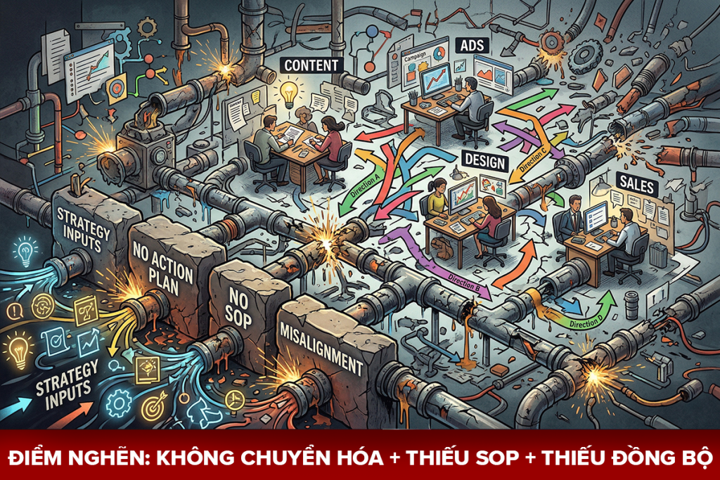 Thực trạng phổ biến hiện nay là doanh nghiệp đầu tư rất nhiều vào việc nghiên cứu và lập hồ sơ chiến lược rõ ràng. Tuy nhiên, khi đi vào giai đoạn thực thi, kết quả lại rời rạc, các kênh truyền thông không nhất quán và mục tiêu doanh thu không đạt được. Điều này đặt ra một vấn đề lớn: Có chiến lược đúng không đồng nghĩa với việc sẽ gặt hái được thành công nếu thiếu đi năng lực vận hành thực tế.